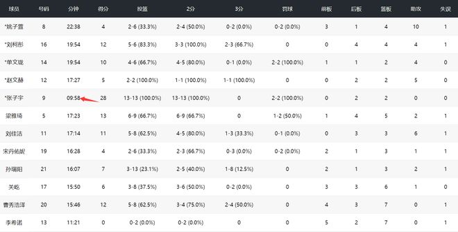 张子宇此役仅仅登场9分58秒,13中13,罚球2中2,拿到28分2篮板,命中率100%,没错10分钟拿28分,平均一分钟拿2.8分,如果张子宇打30分钟不是要拿84分!当然,这是理论上,毕竟张子宇的体能也不允许她打30分钟。
