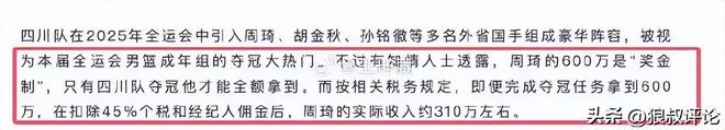 随后,据新民晚报记者李元春报道,周琦与四川男篮的六百万是“奖金制”,只有四川队夺冠他才能全额拿到。而且按相关税务规定,即便完成夺冠任务拿到600万,在扣除45%个税和经纪人佣金后,周琦的实际收入约310万左右。