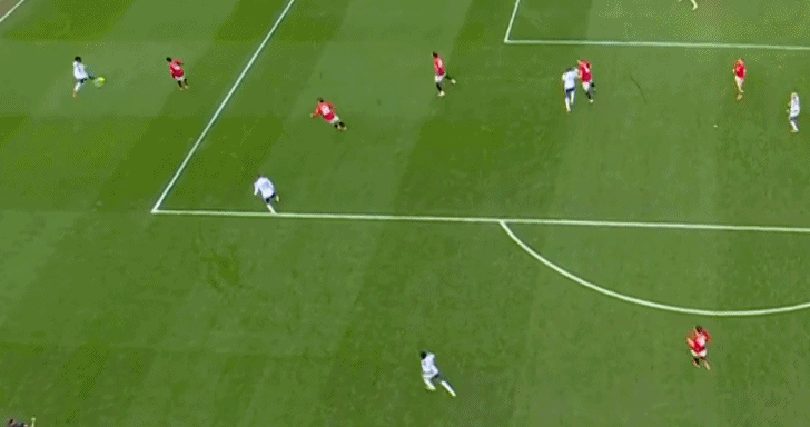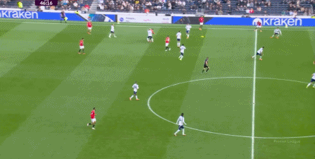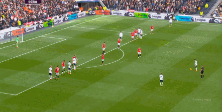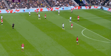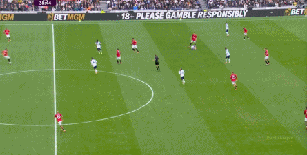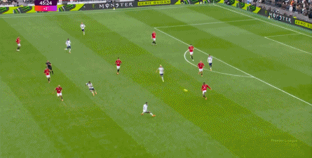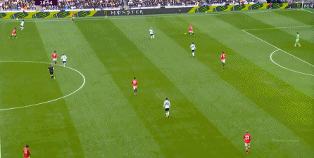 虽然曼联在进攻端的布置在理论上稍有问题,库尼亚和阿玛德-迪亚洛在各自位置上的表现不足很清晰,导致上半场的反制能力没能拔到理论上的最高值,但曼联还是先进一球,而且线路上恰好是右路的阿玛德-迪亚洛传给左路的姆贝乌莫: