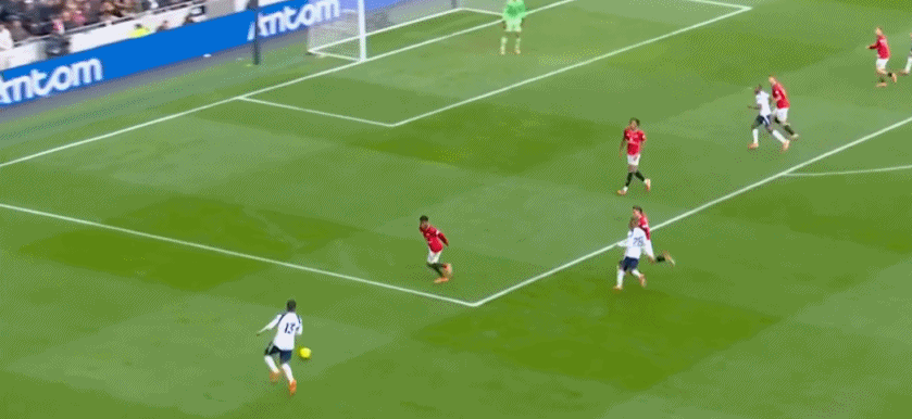 而在丢球时段,尤其是第一球的时候,单单回顾射门环节,你可能会觉得曼联的运气很差,皮球打在德里赫特的脚上形成了变线: